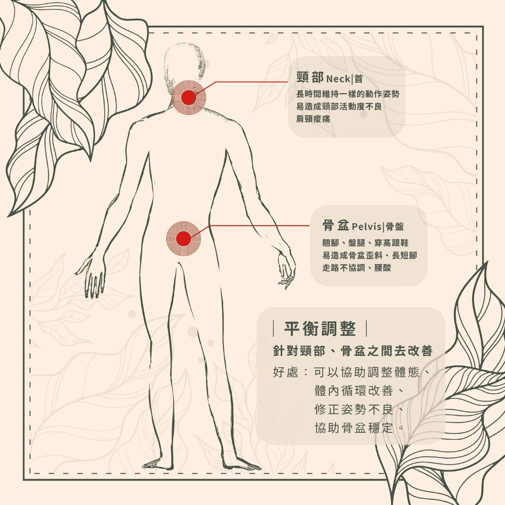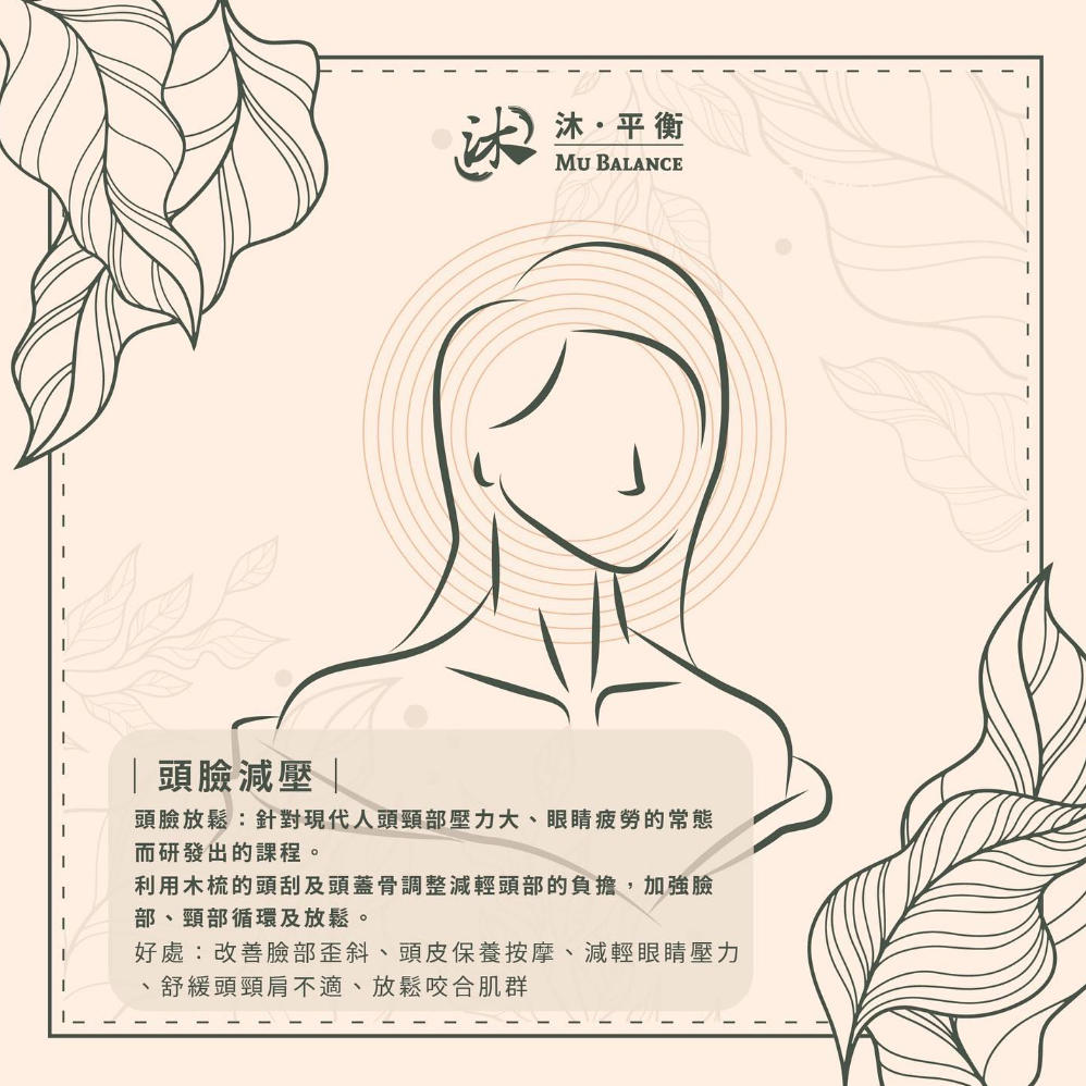 沐.平衡的服務有:全身指壓、油壓按摩、筋膜刀放鬆、被動拉伸、下肢放鬆、臉部張力釋放...等多元服務。